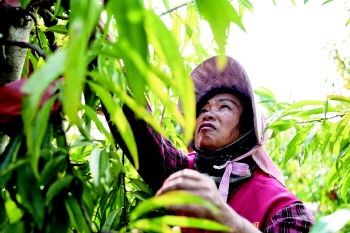 来到石桥镇太白桃园肽桃种植基地,放眼望去,一棵棵桃树郁郁葱葱,一个个泛着红晕的桃子缀满枝头,村民们正忙着将套在袋子里的桃子摘掉,现场一派繁忙的景象。在分拣大棚里,工人们把刚刚采摘下来的冬桃进行分拣、装盒。桃园南邻南阳湖,依水而成,湿润的空气让桃园冬暖夏凉,给石桥肽桃一个最佳的生长气候环境。目前,太白桃园石桥肽桃种植面积达1200亩,有优质冬蜜桃树16万株,单株坐果可达30个,年产优质冬蜜桃50万斤。