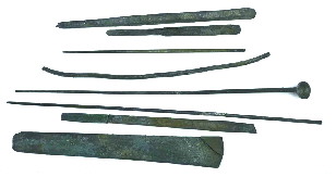 1978年10月至12月,经山东省文化局文物处批准,由济宁地区文物组组成薛国故城调查队,采取重点调查、重点钻、重点试掘的方法,对薛国故城址进行了调查钻探,并在尤楼村东的2号墓地发掘9座周代墓葬,共出土文物1839件,其中有32件(套)收藏于济宁市博物馆,以青铜器居多,包括这套书刻工具。这是迄今为止最为齐全的春秋时期的书刻工具,共计27件,其中有铜斧1件、锛2件、削刀7件、刻刀2件、凿4件、刻针4件、锯2件、钻2件以及磨石3件。估计原有毛笔,可能已朽毁。
