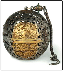 武则天时期,有人设计了一种迷你取暖神器,名“卧褥香垆(炉)”,其实就是香球与迷你火炉的结合。拿来放在被子里取暖、熏香用。它的构造十分精巧,由几个轴心线相互垂直的金属环构成,中央轴心处安装有置放木炭的容器,外面以镂空金属球包裹。神奇之处在于,任凭球体香炉怎么旋转,燃点木炭的容器始终处于水平位置,丝毫不用担心火炭会倾覆、外泄,放进被窝里安全又方便。