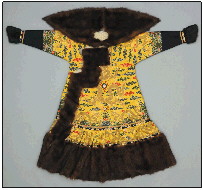 清代明黄色彩云金龙纹天马皮镶貂皮边男朝袍。 现藏故宫博物院