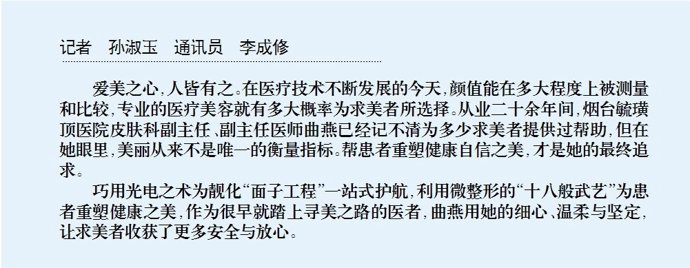 巧用光电之术为靓化“面子工程”一站式护航,利用微整形的“十八般武艺”为患者重塑健康之美,作为很早就踏上寻美之路的医者,曲燕用她的细心、温柔与坚定,让求美者收获了更多安全与放心。