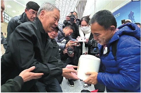 11月11日15时25分许,山东航空SC4782次航班降落在胶东国际机场。刘德文双膝跪地,将老兵的骨灰坛交到老兵儿子陈树森手中。