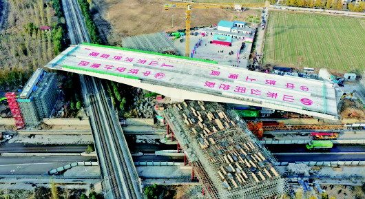 据了解,由山东公用控股有限公司建设、山东济铁工程建设监理有限责任公司代建、中铁上海工程局承建的济曲快速路上跨京沪铁路立交桥工程是全线控制性工程之一,为跨京沪铁路的最大重量、最大纵坡、最大转角的曲线转体梁。