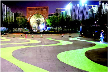 为打造“环保园林”,市园林环卫集团将新型环保材料巧妙应用于园林绿化建设。在海曲印象广场施工过程中,使用PG透水花岗岩进行广场路面铺装,结合荧光石组成波浪状的夜光步道,为市民夜间出行锻炼提供便利。PG透水花岗岩表里丰富的毛孔通道具有强大的透水、抗压、抗折功能,是“海绵城市”建设透水铺材的理想选择,能有效减少资源浪费。荧光石可通过白天自主吸光储存能量,达到夜间发光的环保效果,且在灯光激发下能再次提升亮度,可使用手机等进行绘画玩耍,充分发挥景观亮化、美化作用。