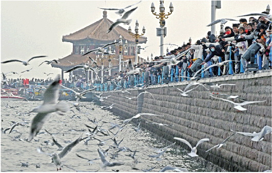 12月9日,游客在青岛市栈桥景区赏鸥、游玩。