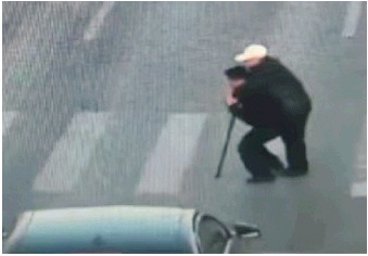 老人费力过马路,房德建背起老人。