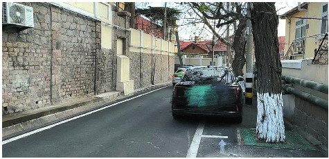 在王统照故居附近,记者找到了韩先生所说的停车位,车位上正停放着一辆黑色轿车。车位前方有一根电线杆、后方有一棵树,占据了车位一半的空间,轿车只能将车身的一半停进车位线内,另一半则停在了线外,占据了部分道路,让本就不宽敞的车道更加狭窄。此外,记者看到,除了这个车位外,还有少量车位存在两棵树在车位线内,以及车位长度较短,小车无法规范停放的情况。