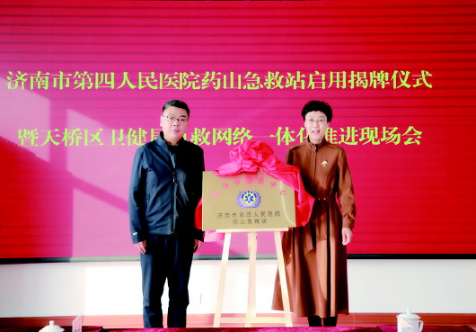 济南市卫健委党组成员、副主任牟鑫,天桥区委常委、副区长周红文,共同为药山急救站揭牌。