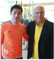 2016年,造访鲁能的贝肯鲍尔同蒿俊闵亲切合影。 山东泰山足球俱乐部
