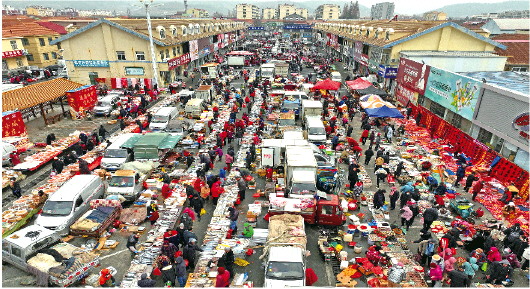 1月14日,在青岛市崂山区王哥庄年货大集上,人们逛集市、置办年货(无人机照片)。春节临近,多地大街小巷年味渐浓,人们在喜庆的氛围中迎接新春佳节。 新华社发