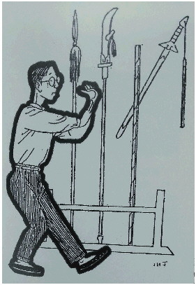 诗人臧克家在青岛初次到老舍家做客,一进门,只见玄关的尽头摆放着刀枪剑戟、斧钺钩叉,以为误入了武术名家的府上,正欲返身离开,幸好被老舍叫住,才知道自己并没有走错门。
