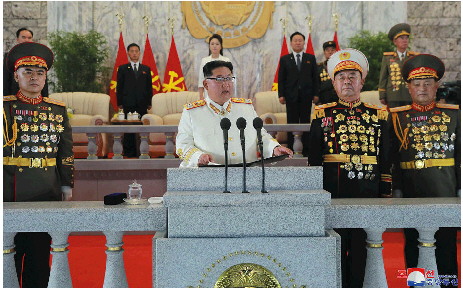 这张朝中社2022年4月26日提供的图片显示的是朝鲜劳动党总书记金正恩(前排左二)在阅兵式上发表讲话。 新华社发