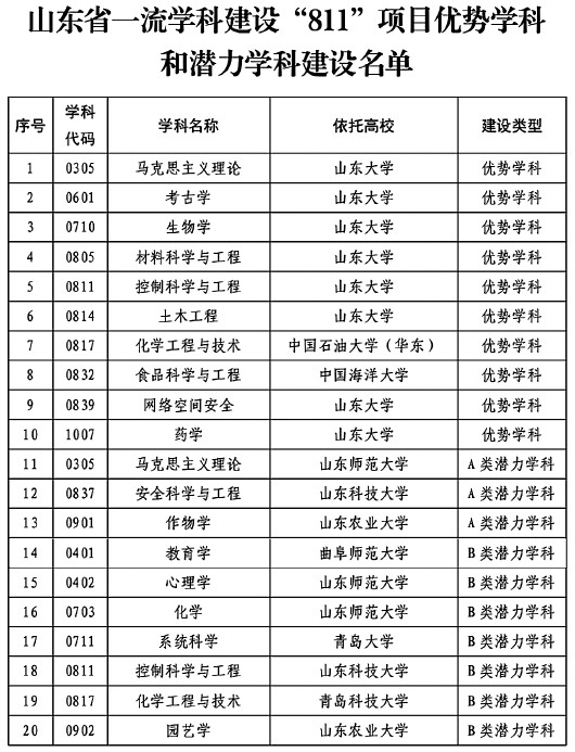 2022年10月,省委办公厅、省政府办公厅印发《关于深入推动山东高等教育高质量发展的若干措施》,正式提出实施一流学科建设“811”项目,支持省内高校8个现有国家一流学科创建世界一流学科;遴选部属高校10个左右优势学科,冲击国家“双一流”建设学科;遴选省属高校10个左右潜力学科,打造冲击国家“双一流”建设学科的后备梯队。