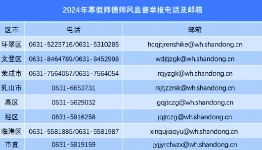 为加强师德师风建设、规范教师从教行为,寒假期间,威海市教育局将加大对师德师风问题的查处力度,持续保持高压态势。对发现的师德违规违纪问题,对“我行我素、顶风违纪”的教师,一律从速调查、顶格处理。