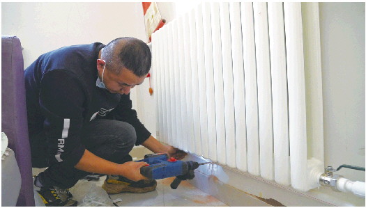 热力公司工作人员正在为林先生家加装暖气片。
