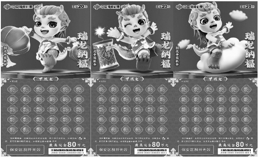 福彩刮刮乐“甲辰龙”生肖系列主题票包括10元面值“祥龙报喜”、20元面值“瑞龙纳福”、30元面值“福龙贺岁”、50元面值“福耀龙腾”四款新游戏,为彩友们送上新春祝福与好运。