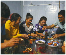 臧运东(右一)和当地群众一起品尝养殖成功的龙虾。
