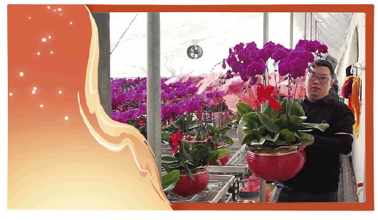 ◥田殿伦在自己的蝴蝶兰种植大棚里。