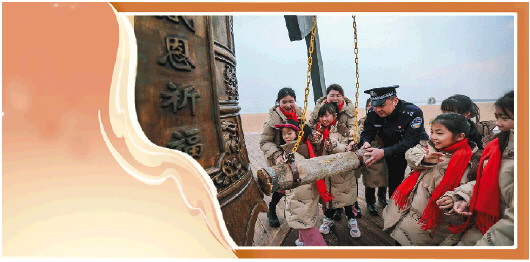 ◥在日照万平口景区,马英和“小砂糖橘”们一起敲响祈福的钟声。