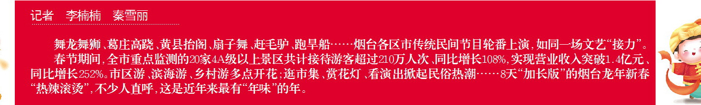 记者 李楠楠 秦雪丽 舞龙舞狮、葛庄高跷、黄县抬阁、扇子舞、赶毛驴、跑旱船……烟台各区市传统民间节目轮番上演,如同一场文艺“接力”。 春节期间,全市重点监测的20家4A级以上景区共计接待游客超过210万人次、同比增长108%,实现营业收入突破1.4亿元、同比增长252%。市区游、滨海游、乡村游多点开花;逛市集、赏花灯、看演出掀起民俗热潮……8天“加长版”的烟台龙年新春“热辣滚烫”,不少人直呼,这是近年来最有“年味”的年。