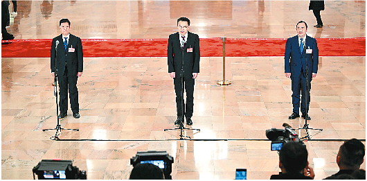 ◥首场“委员通道”集体采访活动在人民大会堂举行。 新华社发