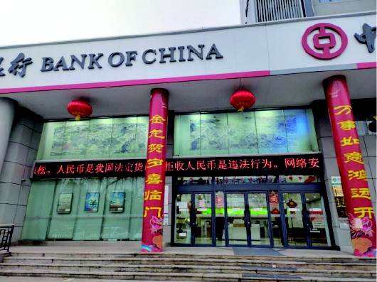 中国银行台儿庄支行在认真学习上级行拒收人民币现金专项治理工作相关文件的基础上,落实分行党委部署,提高站位,加强组织,合理分工,各司其职,认真做好春节前后的人民币宣传和服务工作。