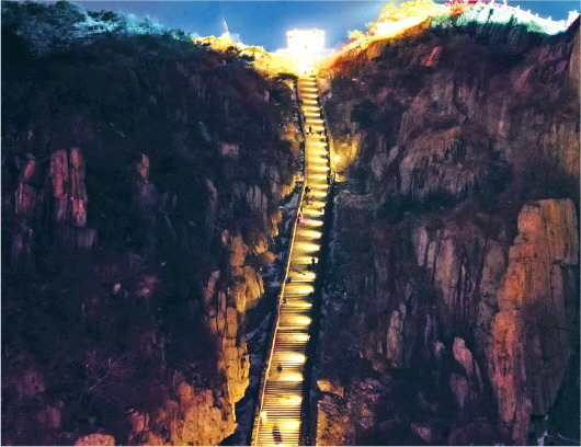 ▲亮灯后的泰山,不仅照亮游客脚下的路,更给夜爬游客解锁全新的体验。
