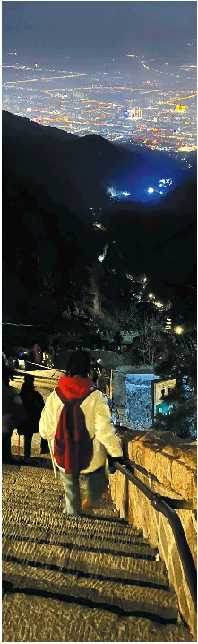 傍晚6点,天色渐暗,小筒灯依次开启,石阶瞬间被点亮。温暖的灯光,斑驳的光影,让泰山披上一层神秘的色彩。黑色天空中,偶尔有星星眨着眼睛。抬眼望去,南天门屹立前方。往下看,静谧山中,两侧山体留下巨大身影,只有夜爬者的脚步声和登山杖触碰地面的声音传来。