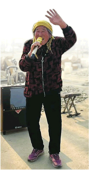 一条黄色的头巾包裹住满头白发,握住话筒的手背上露出黑黝黝的老年斑……沂蒙老人王荣均马上就要80岁了,但只要开始唱歌,她就停不下来。