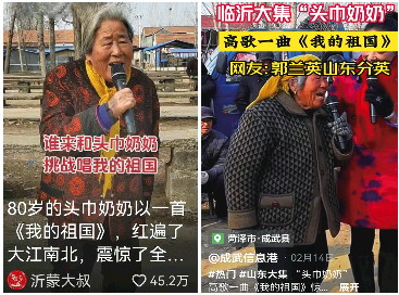 上图:王荣均在临沂大集上高歌。下图:短视频平台上,“头巾奶奶”颇受欢迎。