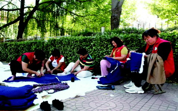 隋桂云(右二)为失能老人缝制棉衣。