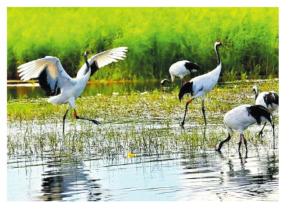 它们就是鹤吗?你看它们高抬的脖颈,透着高贵与不屑;“红顶”的冠冕,飘逸的体态轻盈起落于湿地苇海。丹顶鹤历来是鸟中的公主。短短的百褶裙旋出轻捷的踢踏舞步,高抬腿轻落脚,一个漂亮的投放,优雅尽显。