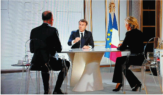 ◥法国总统马克龙(中)14日晚接受法国记者电视访谈时表示,支援乌克兰“不应事先设限”。