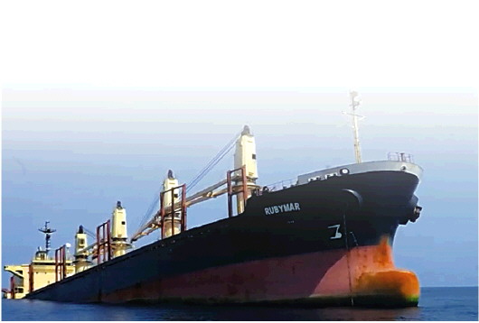 在亚丁湾水域遭胡塞武装袭击的英国货轮“鲁比马尔”号沉没前的景象。 新华社发