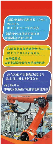 “3月份,综合PMI产出指数为52.7%,比上月上升1.8个百分点,表明我国企业生产经营活动扩张加快。”赵庆河说。