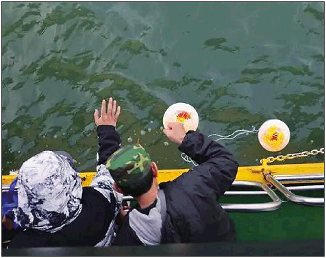 参加公益海葬的逝者亲属将存有骨灰的降解罐缓缓放入海中。