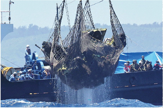 2023年5月2日,日本一艘民间作业船从宫古岛西北海域打捞起疑似为失事“黑鹰”直升机的残骸。