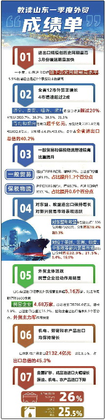 整体来看,一季度山东外贸进出口规模稳中有增、发展质量优中有升,基本盘不断巩固,新动能持续汇聚,开局有力、起势良好,为实现全年外贸“促稳提质”目标打下坚实基础。