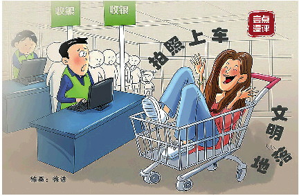 超市购物车,顾名思义,是在购物时临时存放待购商品的;也有“乘坐”功能,但仅限幼童——不少购物车前侧有专门供小孩乘坐的车篮椅,使用时应将双腿伸出购物车。成人乘坐功能则不在此列。试想,成人穿着鞋子蜷坐其中,有安全风险的同时,脚踩他人日常放物品甚至食品的地方,很难说不是踩过了公德底线。