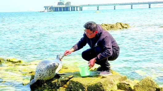 “过来喽,过来喽,来吃饭吧……”只见在不远处游荡的海豹顺着岸边陶志强的呼唤声一溜烟儿地游了过来,“你回来了,你去哪里玩了?回家吃饭吧。”海豹乖巧地仰头听着,好像真能听懂一样。陶志强提着一小桶青鱼踏上礁石,手拿夹子,将鱼肉一块一块地送到它的嘴边。“它特别亲近人,能听懂话,有时候喂食我看不见它,我就会喊一喊,如果它在海里不远的地方,就会立马冒出头游过来找我吃饭。”
