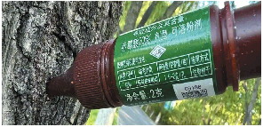 ◥公园中给杨树打的飞絮抑制剂,可以抑制杨树花芽形成。
