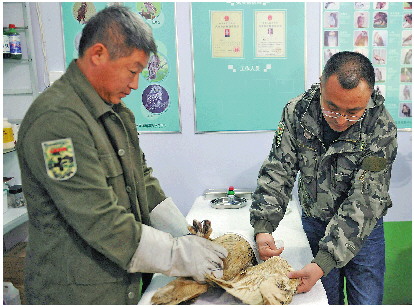 胡海磊(右)在为猛禽检查身体。 受访者供图
