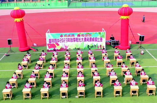 嘉祥四中2023年秋季阳光大课间课桌操比赛现场。