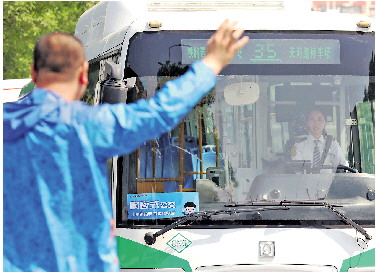 乘客挥手示意驾驶员要上车。