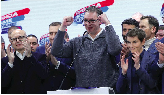 这是2023年12月17日武契奇(中)和武切维奇(左一)、布尔纳比奇(右一)在前进党总部庆祝大选获胜。 新华社发