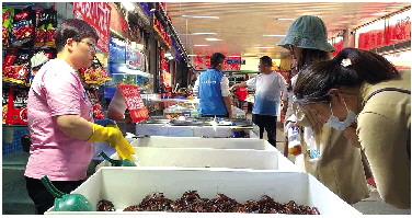 随后,记者又来到某大型连锁商超。在小龙虾卖场,记者发现价签上标有“会员折扣价”字样。“往年小龙虾价格是20多元一斤,今年才19元一斤。”工作人员周女士说,“周末来买小龙虾的顾客比工作日要多。”为保障小龙虾的新鲜程度,这家超市每天早上都会进新货,并要求员工将死虾挑出。