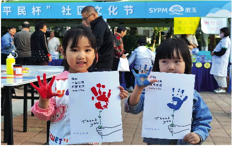 为了让小朋友们能够送给妈妈一份惊喜小礼物,此次社区文化节现场还举办了画一朵“手掌花”小游戏。只见孩子们将手掌涂满颜料,印在漱玉平民大药房提前准备好的卡纸上,不一会工夫,一张张独一无二的画就制作完成了。