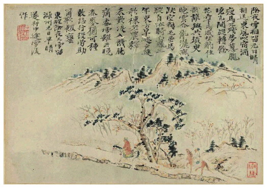 没有文献资料表明,这场大雪下了多久、多厚。但是六百年后的1677年,大画家石涛用画笔描绘了这场大雪,为我们提供了难得的视觉画面。画画在一个册页上,为友人吴彦怀所画。据石涛自题,册页共十二开。从潍州往济州道中遇大雪为第二开。现有九开藏于台北石头书屋,第一开散失在普林斯顿大学艺术博物馆,题“小语辄响答,空山白云惊”,图册整体上因袭截句入画的传统,唯有青州道上遇雪从头至尾全诗抄录,体现了他对这一开的看重。大段的题字,也明显有苏东坡的“石压蛤蟆体”。石涛画作上的题字多为隶书,但这幅题字说明,他在借鉴和汲取苏东坡的书法。兴化教书先生李驎在《大涤子传》就称石涛“得古人法帖,纵观之,于东坡丑字法有所悟”。诗意图进一步证实了这一说法。