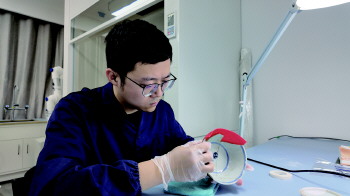 说罢,他捧着瓷碗起身坐回到工作台前。将灯光拉近,取出蜡片烤热软化后,小心翼翼地贴合在瓷碗的完整部分塑形后,再转到破碎的部分,借着完整的模子填上石膏。待石膏风干硬化后,用工具去掉多余的部分,取砂纸细细打磨,直到与完整的部分完美契合在一起后,一次初步的修复工作就算“大功告成”。