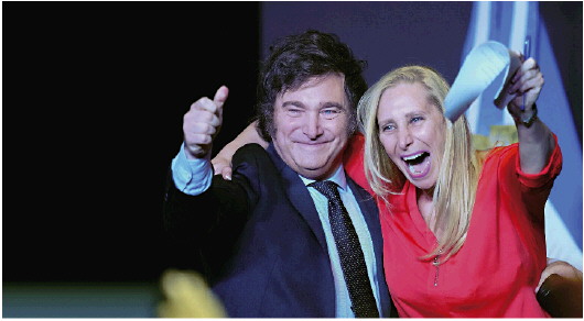 半年内六次降息,基准利率下调至40%;今年以来累计通胀率51.6%;发行面额10000比索纸币;3月工业产出比去年同期猛降21.2%……这些看起来“离经叛道”的数字,正出自执政刚满半年的阿根廷总统哈维尔·米莱之手,他正在实施旨在挽救经济的“休克疗法”。当初,阿根廷近56%的选民选择了米莱这位“政治素人”,而他背后有一位对其影响力巨大的妹妹卡琳娜·米莱。如今,这对兄妹一个身为总统一个担任总统府秘书长,两人正在改变着阿根廷。